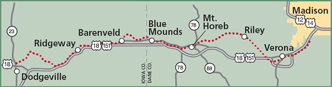 We had been enjoying a fairly flat to almost downhill trail to this point. Anything that goes up must eventually go down or in our case, just the opposite. Shortly after our luxury rest stop, it did. As the trail continued up, doubt began creeping into my mind. Bailey’s progress had slowed considerably and with it mine and Kathryn’s. We started a process that would become Bailey’s biking tradition. Just as she would begin to ask the inevitable “how much farther?”, we would begin to sing her favorite song, “Denise Denise”. I find it ironic, that all these years later, her daycare provider is…..you guessed it, Denise. We were well into the thousandth repeatition of the song, when finally, the trail turned downhill and we coasted into Mt Horeb.